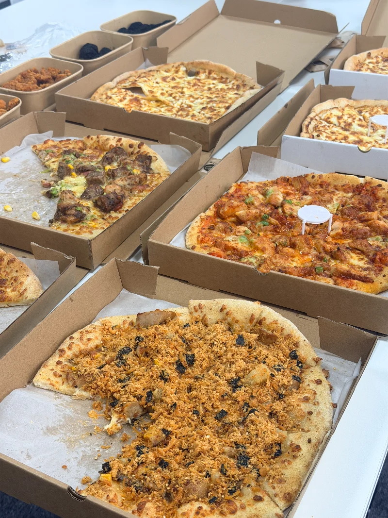 ပီဇာသေတ္တာများ စားပွဲများ ပြည့်သွားကာ ရုံးခန်းသည် ချက်ချင်းပင် အရသာရှိသော ရနံ့များဖြင့် ထုပ်ပိုးထားသည်။ ပင်ပန်းနွမ်းနယ်မှုက အချိန်တိုအတွင်း ပျောက်သွားတယ်။ လုပ်ဖော်ကိုင်ဖက်များသည် ၎င်းတို့၏ မော်နီတာများကို ချောင်းကြည့်ကာ မျက်လုံးများ လင်းထိန်လာသည်။ တစ်စုံတစ်ယောက်က "Pizza ဒီမှာ!" ဒီအတိုင်းပဲ အဖွဲ့တစ်ဖွဲ့လုံးက ဝိုင်းဖွဲ့ကြတယ်။